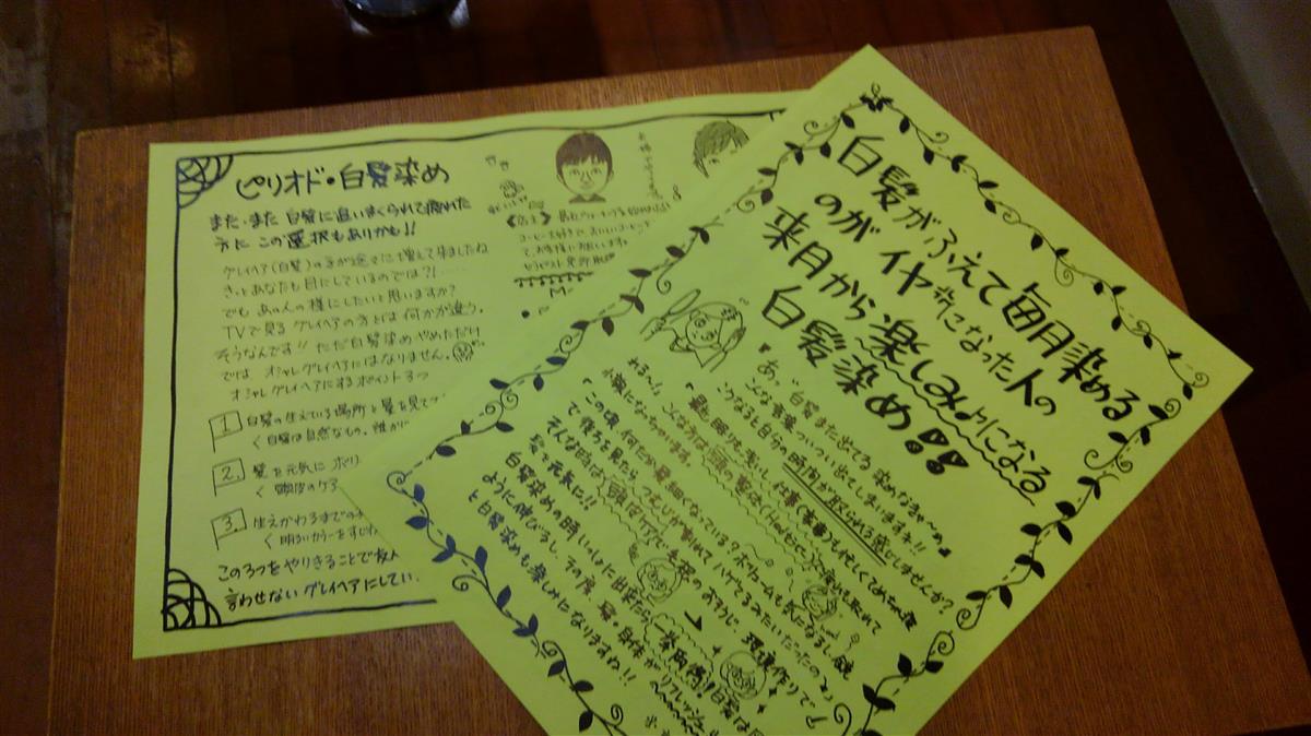 今回のチラシは、白髪染めにポイントを置いたチラシにしました。最近、グレーヘアー(白髪のまま)の方が、街中でよく見るようになりましたが、トータル的に考えてグレーヘアーを楽しんでいる方より、ただ染めるのを辞めただけの方が、多いように見受けられます。グレーヘアーは、お手入れをしないと極端に老けて見えたり、貧相なイメージに取られたりしますので気負付けなければ行けません。これからチャレンジされようと思われる方は、染めるのが面倒くさいと言う理由でグレーヘアーを選ばれる様でしたら染める作業中の方が、遥かに楽だと思います。染める施術が少しでも楽しみになるような提案にしていますので、ポストにチラシが入っていたら読んで頂けると嬉しいです。