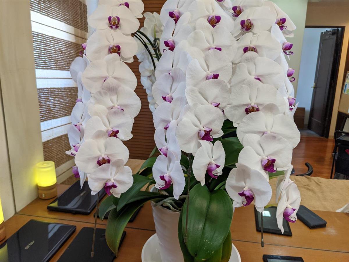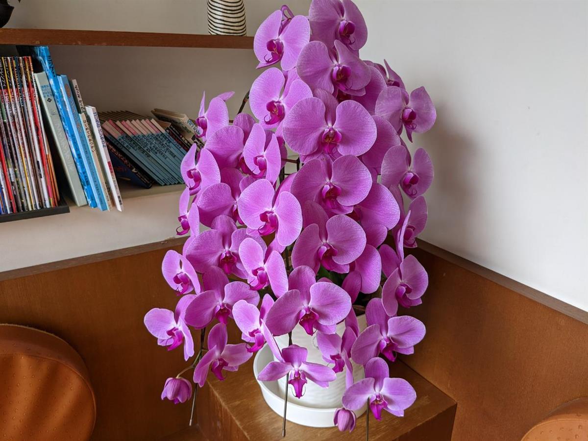 長女の会社が移転開設したので、会社関係からお祝いで頂いた蘭を譲って頂けることになったからです。かなり沢山になりこのまま置いていると環境が良くなく枯れてしまうとのことで、大事に育ててくれる方でしたら譲って頂けるとのことで、妻が蘭が好きなのを娘が知っていたので二個の蘭をいただきました。私は、もっと小さいサイズだと勝手に思っていたので、あまりに大きかったのでびっくり‼お店が華やかになる位インパクトがあります。大切に育てていきたいです。妻は、以前頂いた蘭をもう一度咲かせるように育てているのでこの花も次につなげる様に出来る事を期待しています。