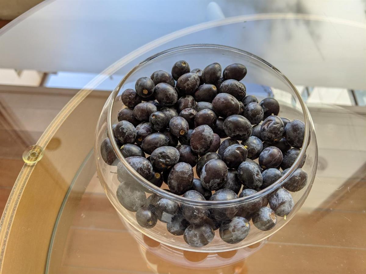 昨年もオリーブの実は付いたのですが、実をもっと大きくなるのかと思い放置していましたら熟すことなく落ちてしまいましたが、今年は大きさは昨年と同様でしたが実が熟してきましたので、完熟になるまで待ちこの間剪定して収穫しました。自宅でオリーブオイルを作れないかと検索した所やり方が解ったのでチャレンジしてみるとお客様と話したらほとんど取れないよと教えて頂きました。でも、捨てるのも勿体ないのでやってみることにしました。どうなるのか?