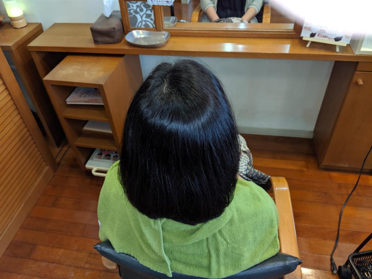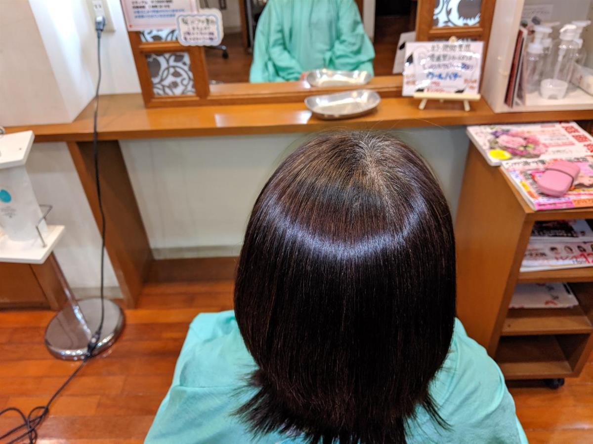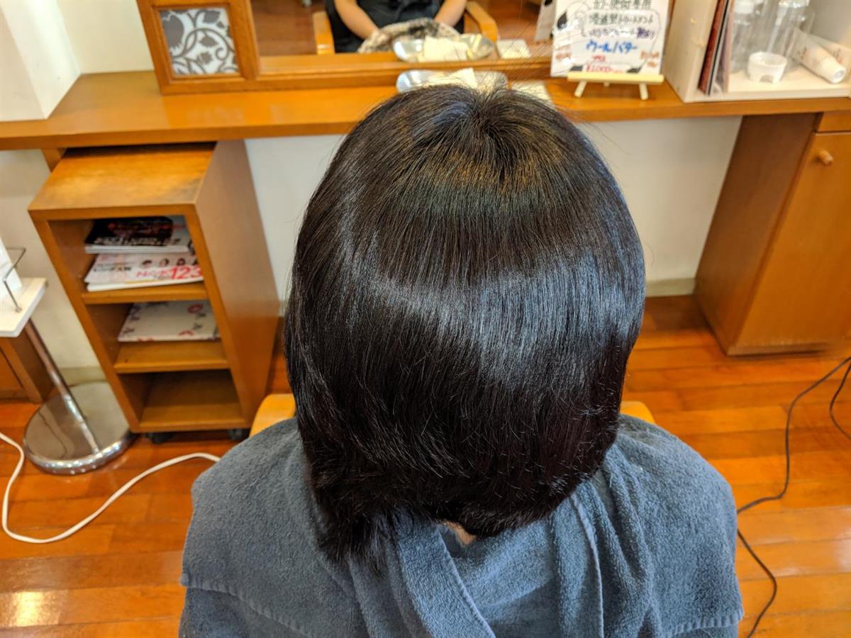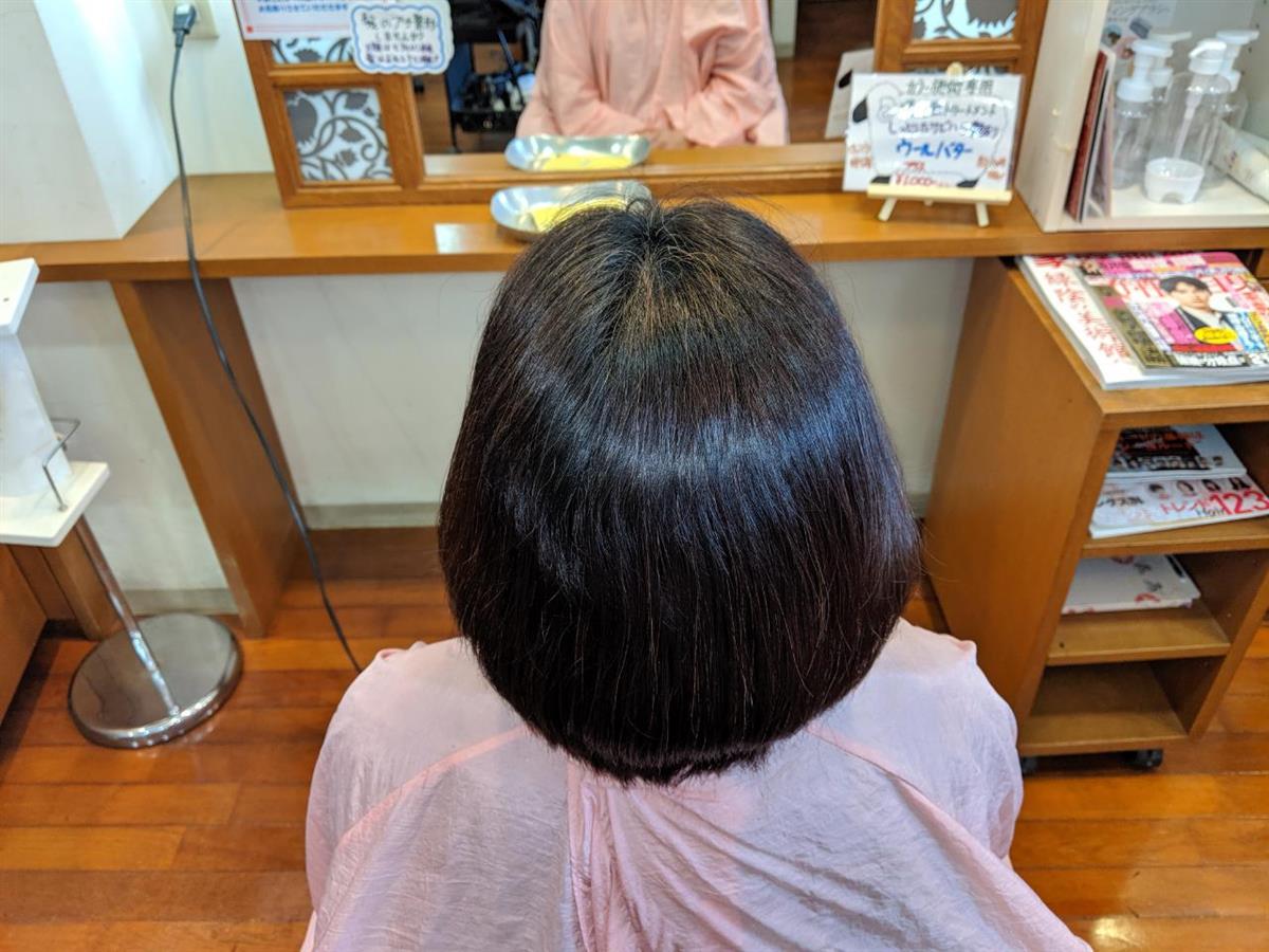 先天的癖毛でうねる感じに出る髪質です。髪フル施術は今回で2回目になります。縮毛施術との併用は、初めてとなりますが癖もしっかりと伸びているし、艶感もありダメージも残さなかったです。その後ヘアーカラー(ウールバターしました)を施術しましたが、ダメージが出ることもなく仕上りました。