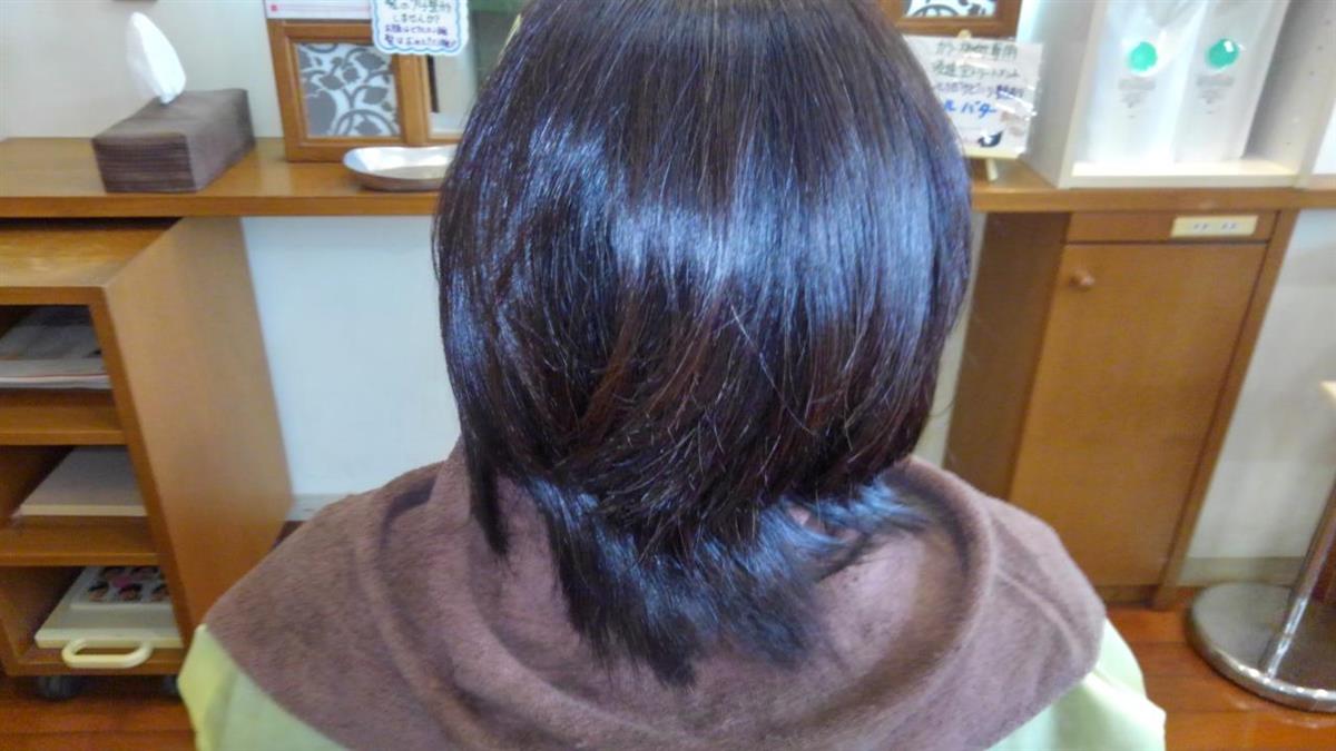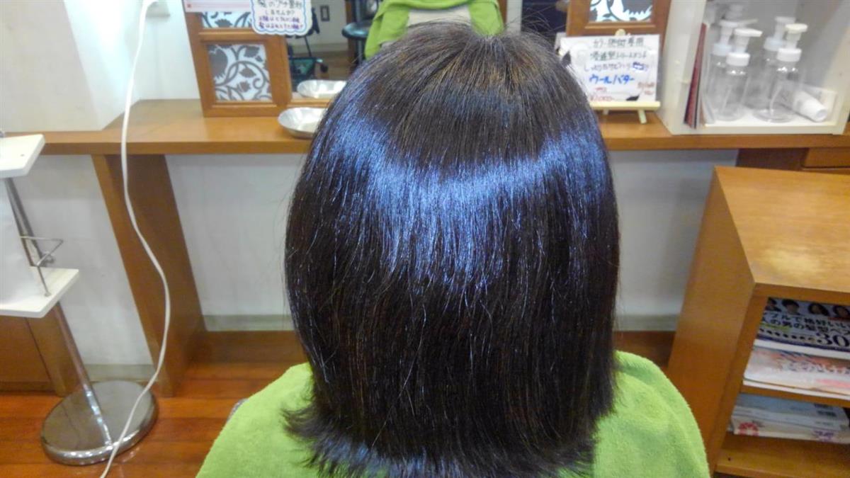 先天的癖毛ではありますが、わりと良い癖毛でパーマスタイルの様にキレイにウェーブが出ますが、肩ラインでボブ風にスタイリングしてしまうとボリュームが出すぎて収まらなくなりますが、髪フル施術後は軽くブローで収まり艶感も出ました。