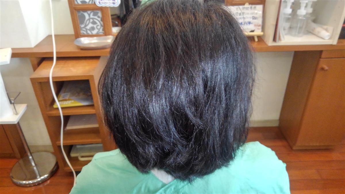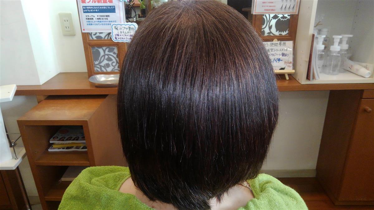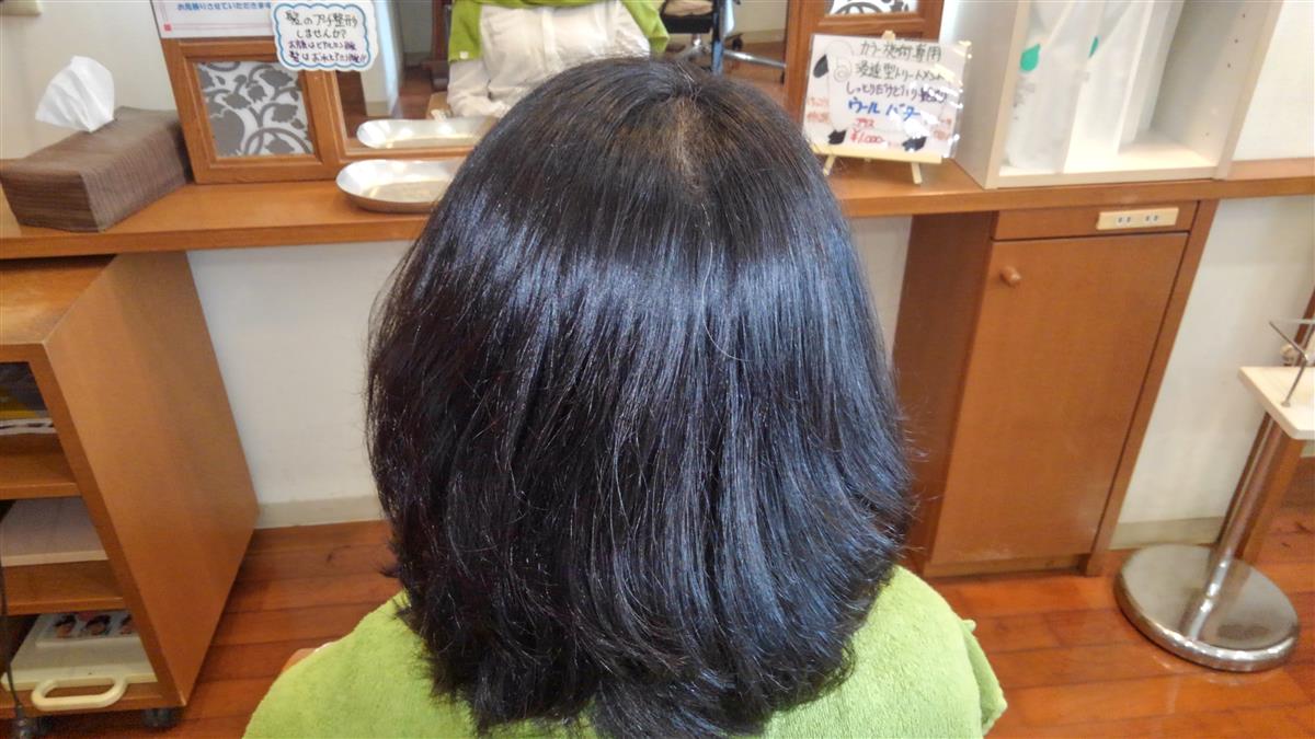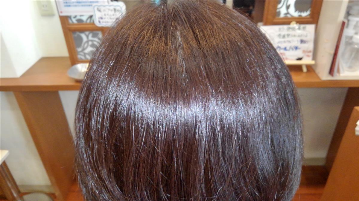 この施術は、カラー施術専用トリートメントでカラー剤の力を借りて髪の内部に粒子の細かい羊毛から取った脂を入れ込む技術です。髪フルに近い技術ですが、髪フルはアルカリの水を使うので全メニューに対応出来ますが、ウールバターはカラーのみになる所が違いとなります。この写真は、一か月以内に髪フル施術を行っていてこの日は、事情により髪フル施術を2週伸ばしたいがカラーをしたいとの要望があり、間メニューとしてカラーバターをしました。髪フルの艶感も損なうことなく仕上がりました。