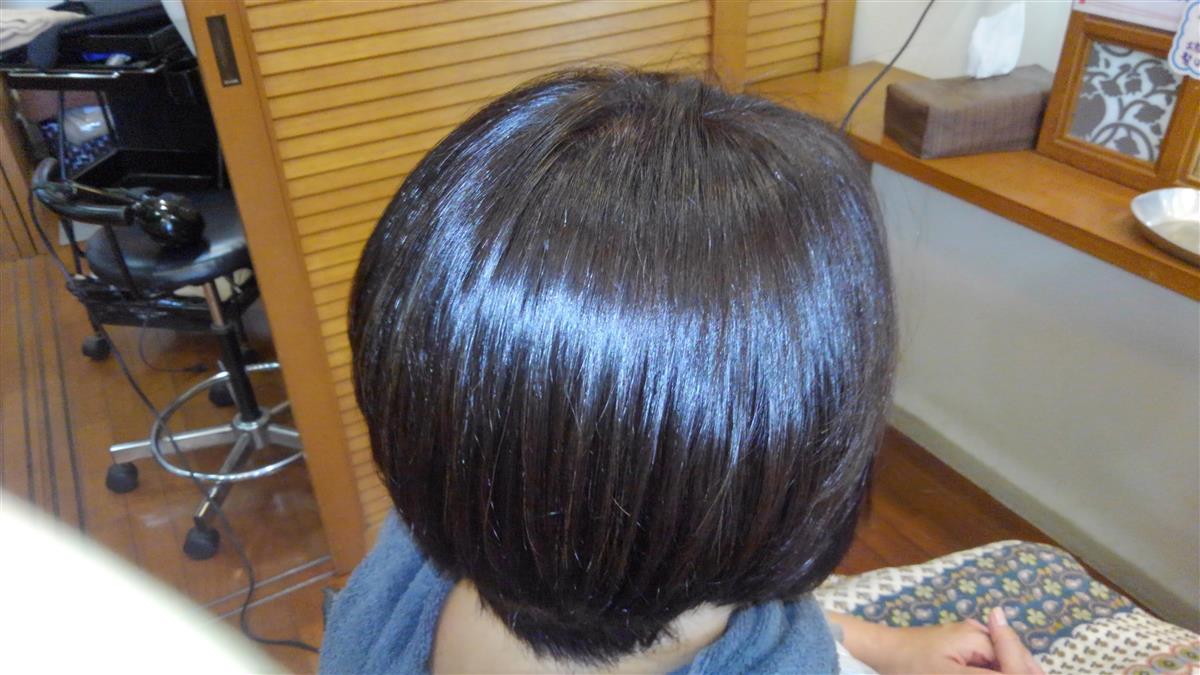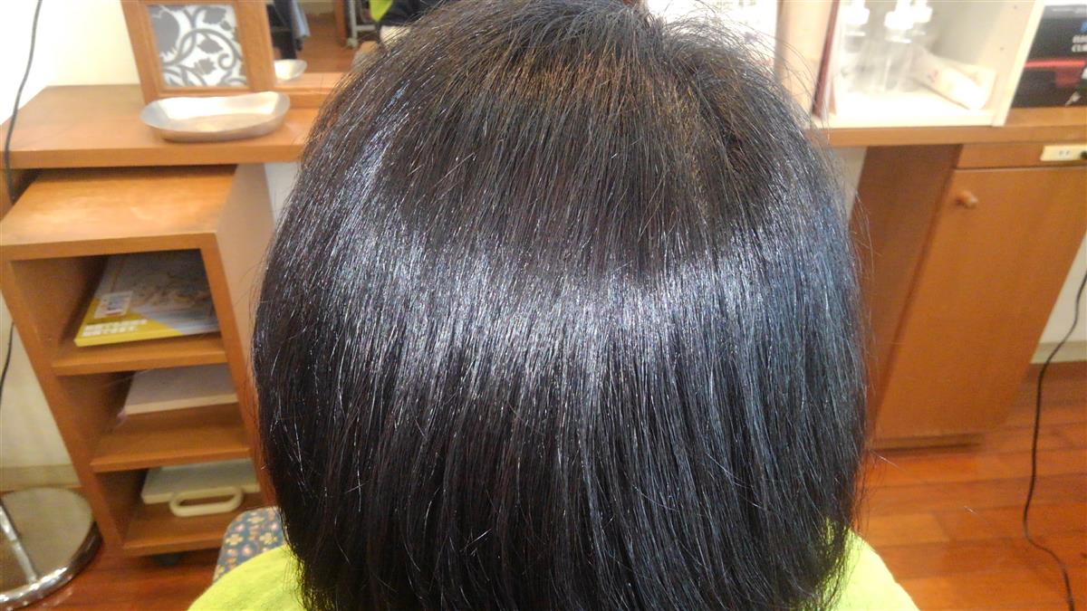 この二枚の写真は、共に髪フル施術後のものです。硬い髪質は、内部に入れ込むのは大変ですが、アルカリ水の力はしっかり働き艶感・手触り感を出してくれました。髪質で施術方法は多少変わりますが、どんな髪質も対応出来ます。