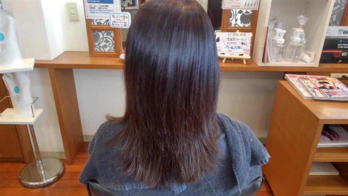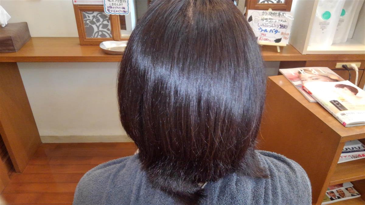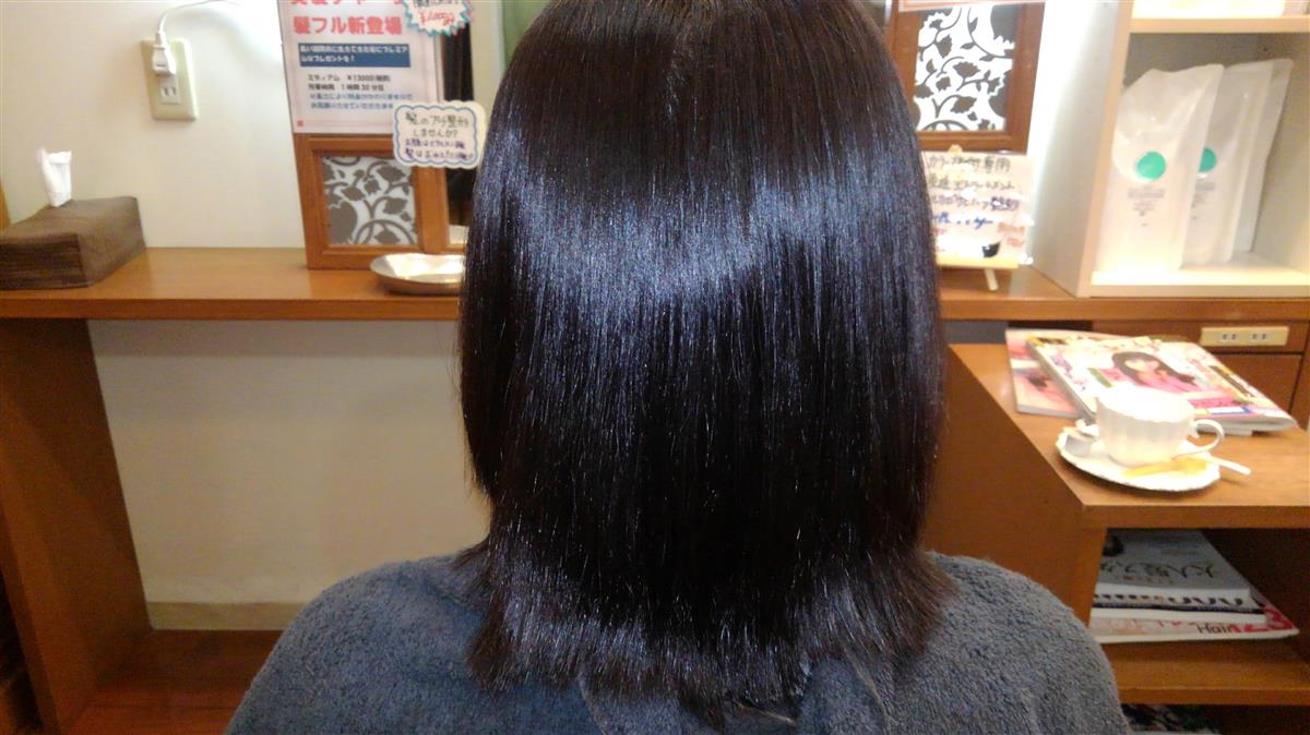 縮毛矯正が入っている髪に髪フルを入れて3~4㎝カットしています。襟足の方は、長さが短いため癖が出てきていますが、収まりが良いので、あまり気にならないと思います。髪フルの施術した後に縮毛矯正施術するととてもよい結果が出るようです。