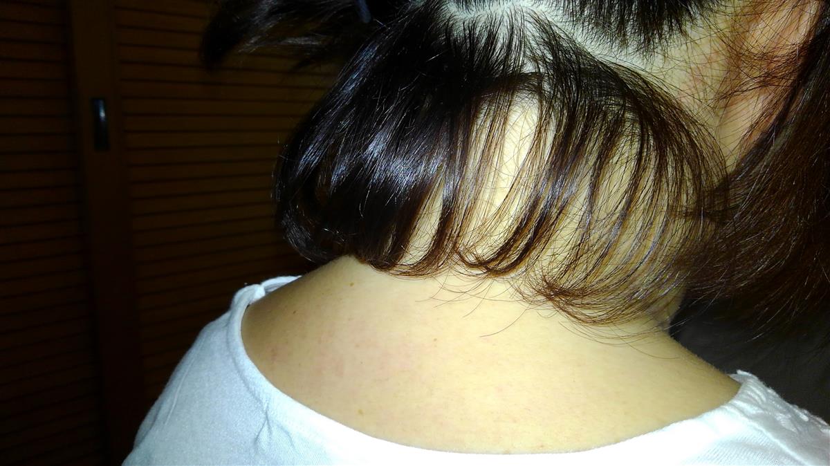 襟足の髪の生え方は、人それぞれですが、かなり強い生え方の人が多いと思います。そのために、やりたいスタイルを断念せざるを得ない事もあります。例えば、写真の様に襟足が上を向いて生えている方は、襟足に沿うようなスタイルをどうしてもしたいときは、襟足の上がっている所を刈り上げる様に無くしてしまうしかありませんでした。そうすると新たに髪が生えてきたときお手入れが難しくなってしまいますが、矯正カットで施術するとある程度髪が下に降りるためワックスなどを使用すれば希望のスタイルを作る事が出来ます。今までに、諦めていたスタイルがある方はお声を掛けて下さい。