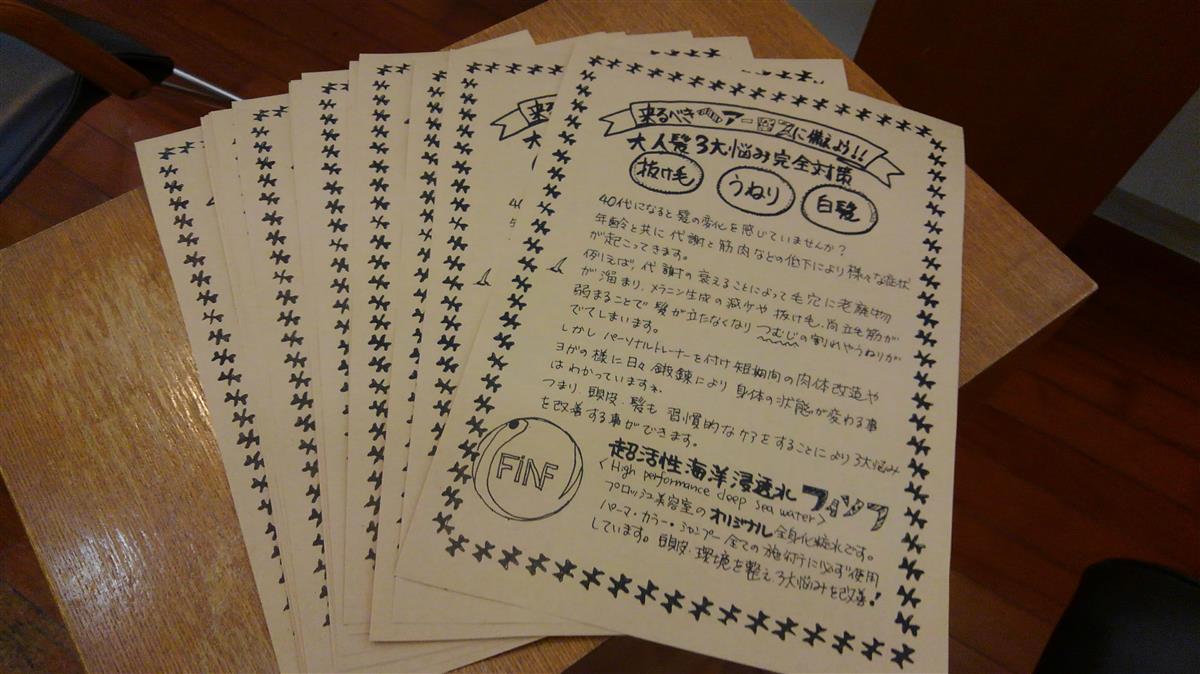 私共は、オープン当初1~2年はフリーペーパーなどの広告をしていましたが、それ以降は全てポスティング(自宅ポストに投函する事)でチラシを配布する方法をして来ました。私が原稿・妻が手書き&パソコンでチラシを作り印刷屋さんに頼むという形で行っています。妻が、以前から茶色の紙で作りたいと言うので、印刷屋さんにお願いするといつもイメージと違うので、昔学校で使っていたワラバンシの様なと表現すると、小口では、出来ないと断られていました。今、お世話になっている印刷屋さんにダメもとで声を掛けて見たら、クラフト紙では?と言われてまさにイメージ通り、何故今まで気づかないのか?印刷屋さんからするとクラフト紙は、物を梱包する時などに使用する用途で、この紙に印刷する事は考えていなかったそうです。実は、思い付きで言ってしまったが綺麗に印刷出来るか心配だったそうです。思ったより暖かいイメージに仕上り良かったです。ポストに入っていたら読んで頂けるときとても嬉しいです。