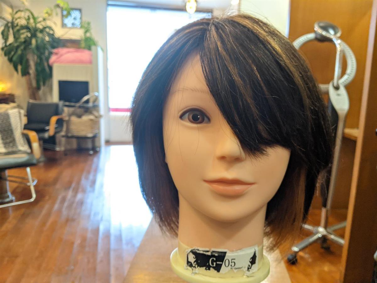 一般的にヘアーカラーと言うとアルカリ性カラーとなるくらい一番多いカラー施術ですが、やはり欠点もあります。頭皮や髪にかなりの負担が出ることですが、今はカラーブームもありより負担の大きいブリーチ施術も増えている状況です。確かに当サロンの髪フル施術もそうですが、ケアー出来る施術も増えては来ていますが、ダメージがないわけではありません。そこで、クローズアップされてきているのが付着型カラーとなりますが、これも万能ではありません。地毛の明るさよりも明るくはならないし、色の持ちも良くはありません。そこで、最近注目しているのが、ケアー施術の中で色が付く付着型カラーが出ることになりました。まだ、実験中ですので、紹介は出来ませんが、今回写真に上げたスライジングの入った7レベルのウィッグに4色の色見を入れて行きますので楽しみにして下さい。